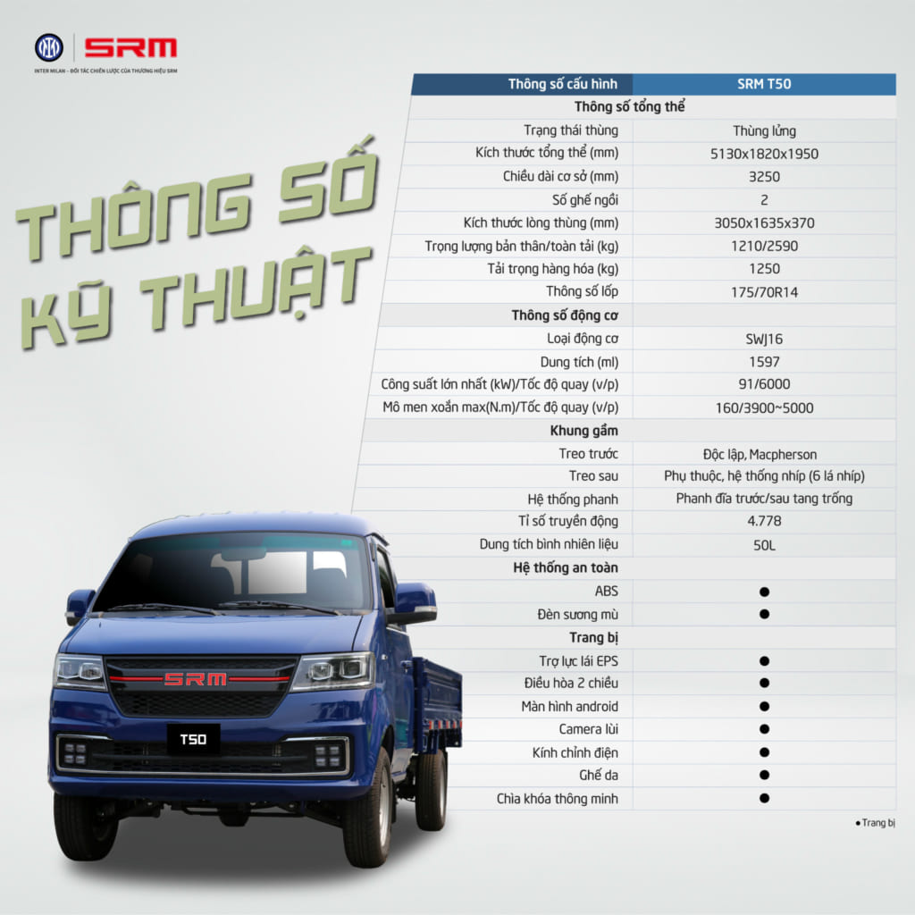 *Thông số kỹ thuật Xe Tải Srm T50 1250kg Thùng Lửng
