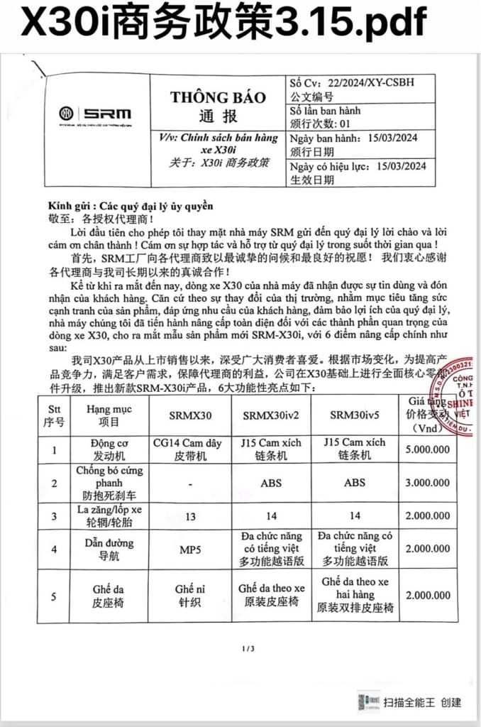 Từ ngày 15/03/2024, Nhà máy Srm tiếp tục nâng cấp sản phẩm lên Xe Srm X30i với 6 chi tiết cải tiến mới. Giá phiên bản Xe Srm X30i mới sẽ tăng 8 triệu/xe.