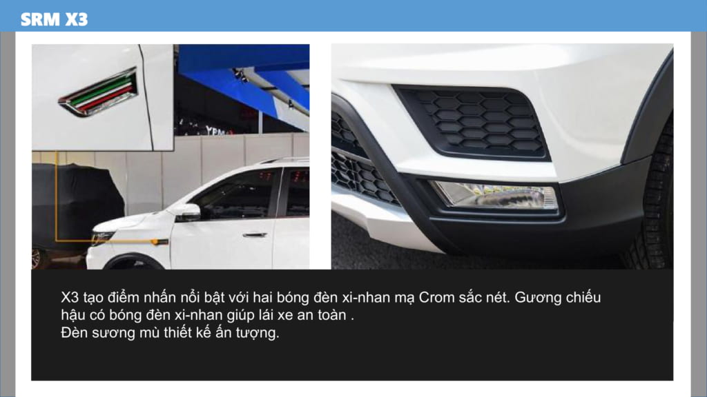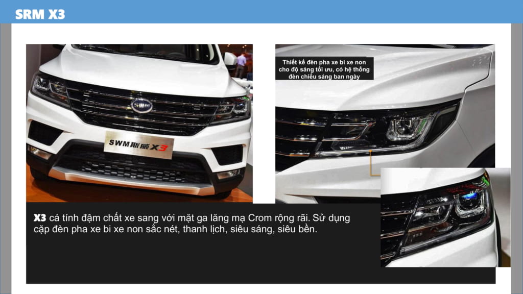 XE SWM X3 7 CHỖ cá tính đậm chất xe sang với mặt nạ ga lăng mạ Crom bản lớn. Sử dụng cặp đèn pha bi xenon sắc nét, siêu sáng và bền bỉ. Về hình thức, xe đáp ứng tốt yêu cầu đẹp, sang trọng, hiện đại của 1 dòng xe du lịch phổ thông.