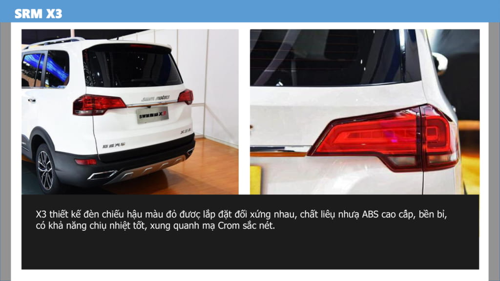XE SWM X3 7 CHỖ thiết kế đèn hậu màu đỏ, chất liệu nhựa ABS cao cấp, chịu nhiệt tốt, viền mạ crom. Kiểu dáng góc cạnh, khoẻ khoắn, được mượn từ những thiết kế xe cao cấp.