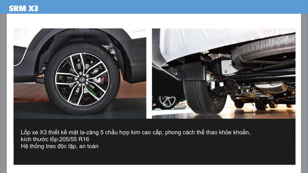 Lốp XE SWM X3 7 CHỖ có la-zang 5 chấu hợp kim cao cấp, phong cách thể thao khoẻ khoắn. Kích thước lốp: 205/55 R16 giúp xe nhìn thể thao, khoảng sáng gầm xe cao hơn, đi được đa dạng địa hình.