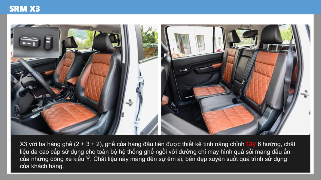 XE SWM X3 7 CHỖ với 3 hàng ghế (5+2), ghế hàng đầu thiết kế chỉnh tay 6 hướng. Chất liệu da cao cấp sử dụng cho toàn bộ hệ thống ghế ngồi. Với đường chỉ may hình quả sồi mang dấu ấn của những dòng xe kiểu Ý.