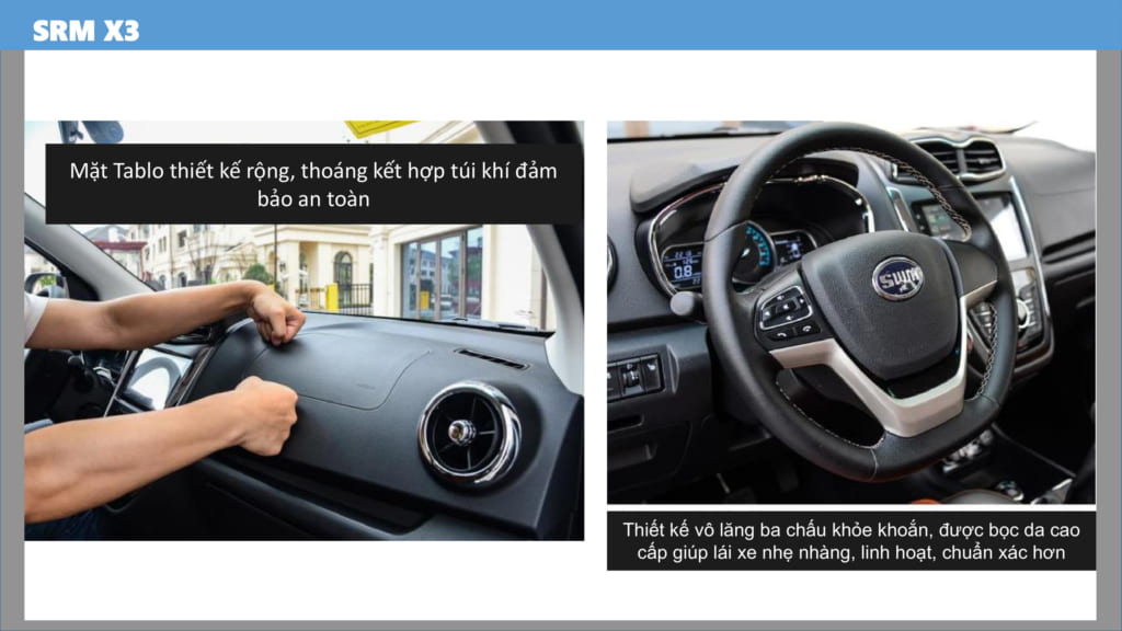 XE SWM X3 7 CHỖ có 2 túi khí phía trước, đảm bảo an toàn cho người lái. Thiết kế vô lăng ba chấu thể thao phong cách BMW, được bọc da cao cấp. Hệ thống điều hoà 2 chiều với công suất cực lớn. Giúp làm lạnh sâu, quạt gió êm vối cả công suất lớn nhất.