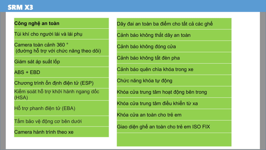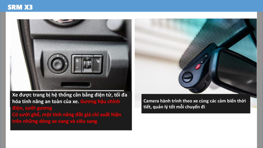 XE SWM X3 7 CHỖ trang bị hệ thống cân bằng điện tử. Nâng cao độ an toàn của xe khi vào cua hoặc đường trơn trượt. Gương hậu có thể điều chỉnh bằng điện. Sưởi gương, giúp lái xe dễ quan sát kể cả trời mưa. Xe có trang bị ghế sưởi, giúp làm ấm nhanh vào mùa đông. Camera hành trình giúp ghi lại lịch trình di chuyển của xe.