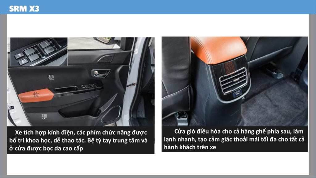 XE SWM X3 7 CHỖ có trang bị kính điện, bệ tỳ tay được bọc da. Cửa gió điều hoà cho các hàng ghế sau, làm lạnh nhanh cả xe.
