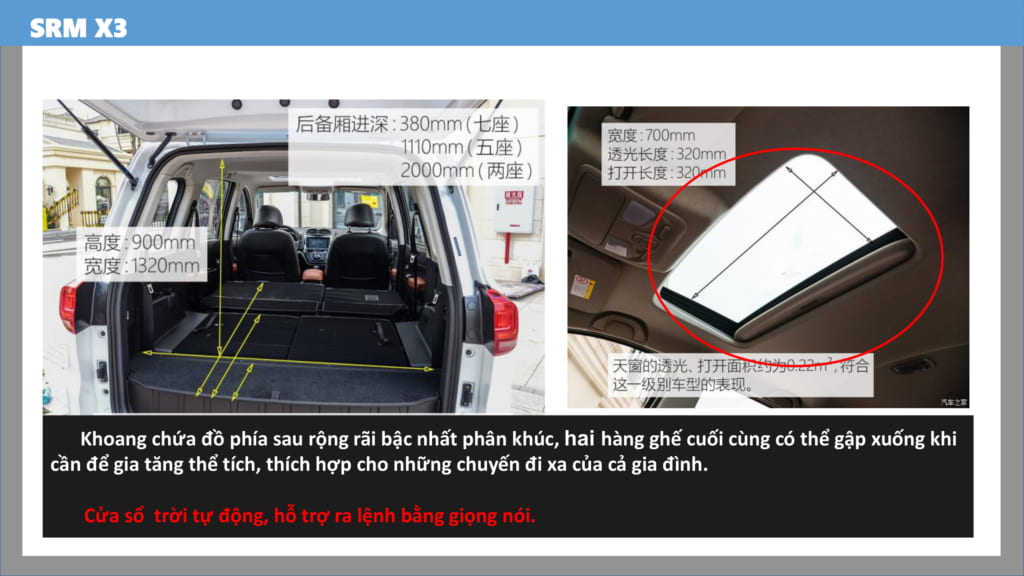 XE SWM X3 7 CHỖ có khoang chứa đồ phía sau rộng, dài 1320mm, cao 900mm. Hàng ghế thứ 3 gập lại được. Xe được trang bị cửa sổ trời hiện đại.