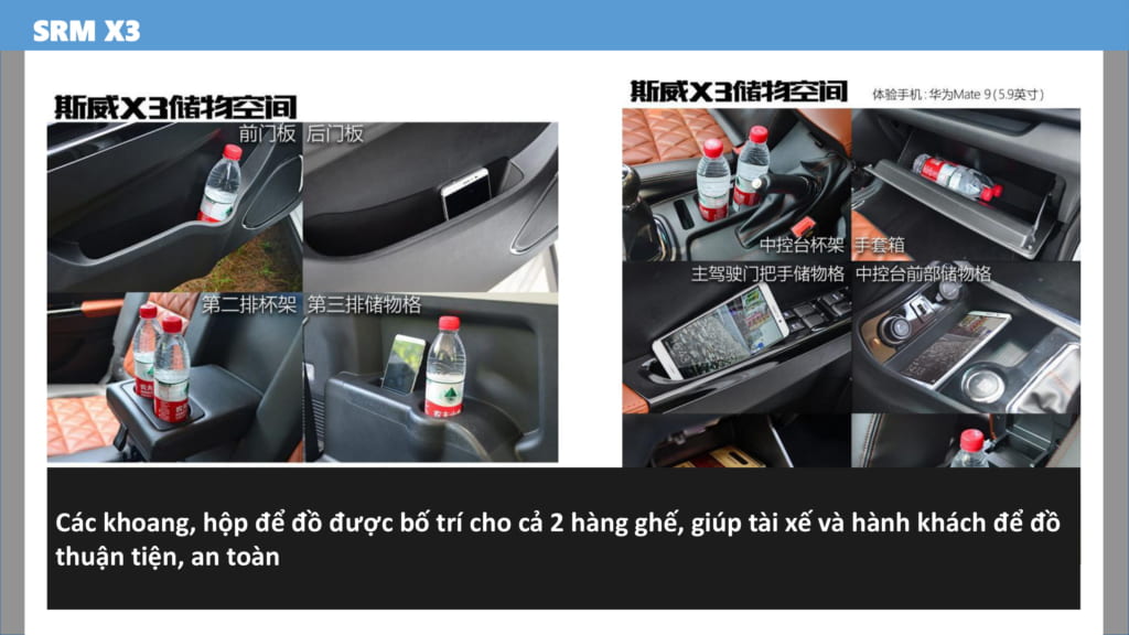 Khoang để đồ được bố trí quanh XE SWM X3 7 CHỖ thuận tiện, giúp lái xe để được tất cả các vật dụng như: chai nước, điện thoại, ví . . .